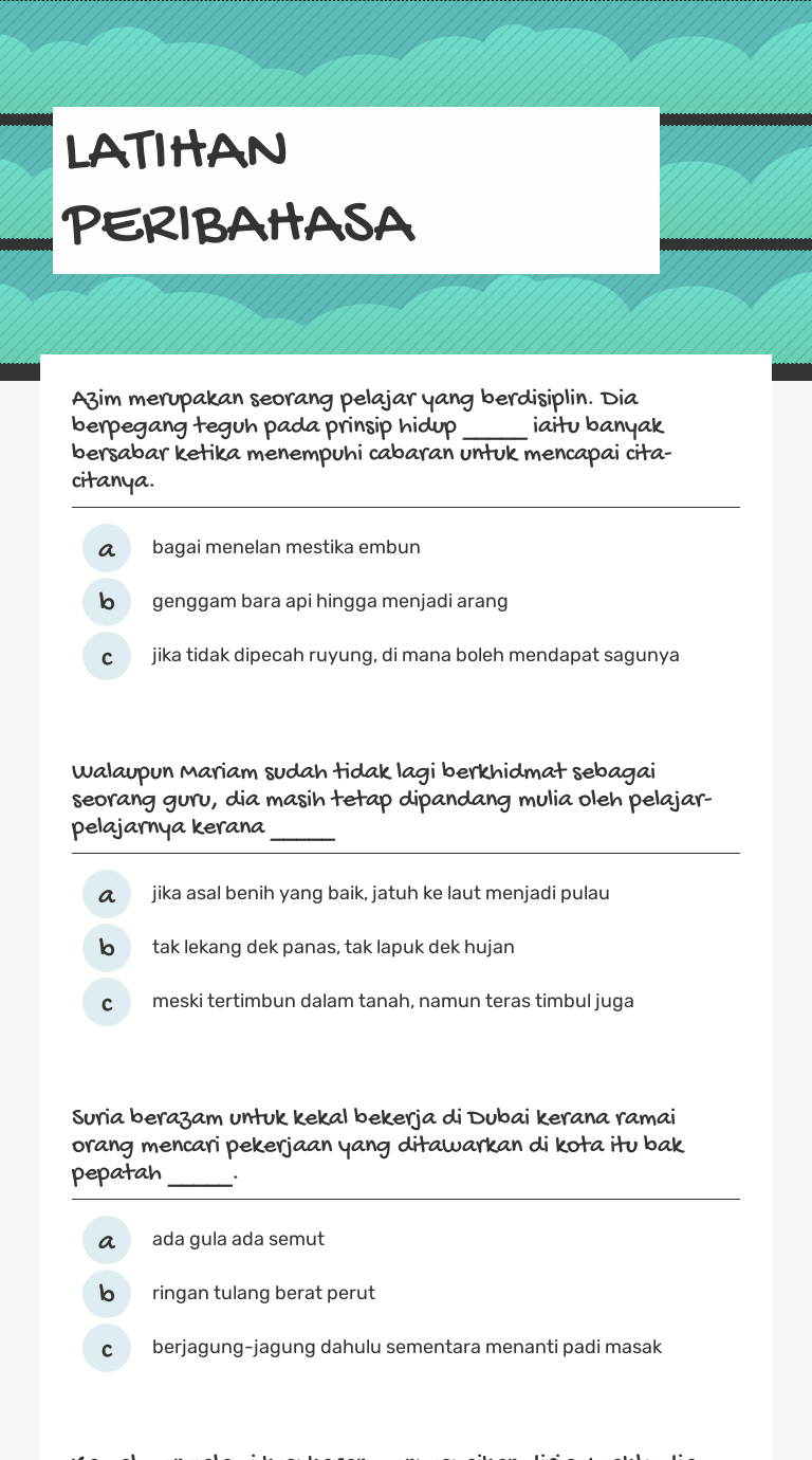 Contoh dalam peribahasa ditandai dengan warna oranye; Jangan salahkan kami para nyamuk, jika darahmu adalah salah satu sumber rejeki kami. Pernyataan ini sering diucapkan dalam upacara perkawinan ultra posse nemo obligatur Selepas si bulus telah divaksin, hampa tak dibenarkan memandikan kucing selama lebih kurang 1 minggu. 06.08.2020 · bak kata pepatah, di mana ada gula, di situ ada semut. Purwadi, m.hum eko priyo purnomo, sip —————————————————…